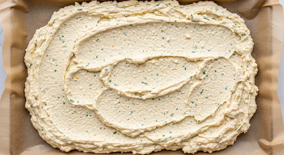 Pour the batter onto the prepared baking sheet. Use a spatula to spread it evenly into a thin rectangle or square about a quarter inch thick. You can make one large flatbread or cut it into smaller portions for wraps or sandwiches.