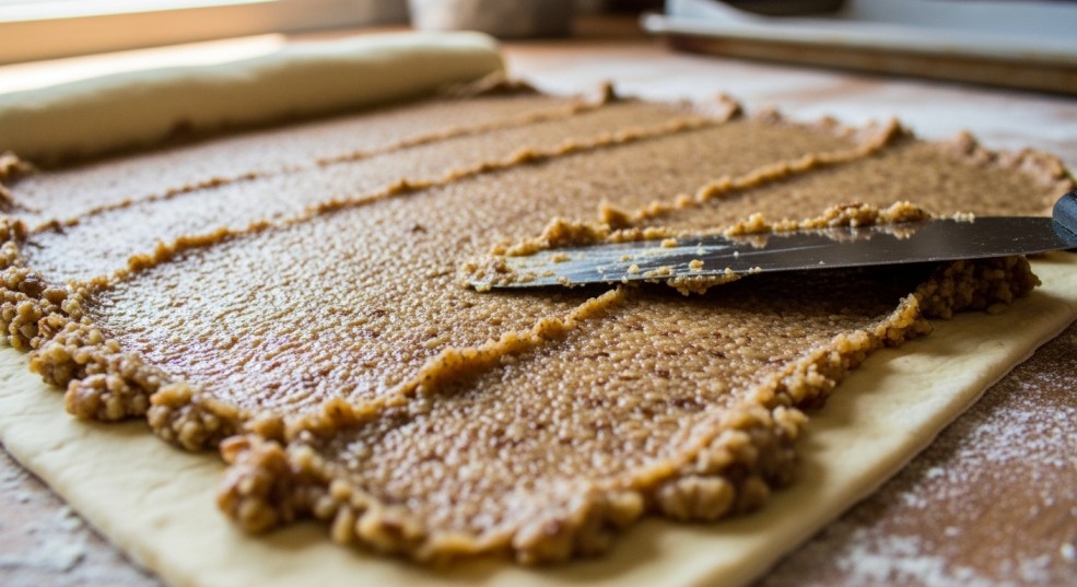 Spread half of the nut filling evenly over the dough. Leave a small border along the edges. Use a spatula to spread gently so the dough does not tear.