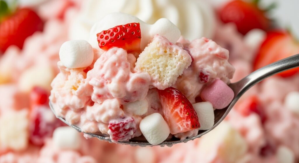 This fluff salad is cool and creamy with small bites of strawberry and cake in every scoop. It reminds me of classic strawberry shortcake but in a lighter and more playful form. You do not need an oven, and everything comes together with simple mixing and gentle folding.