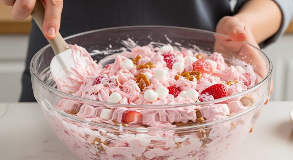 This fluff salad stands out because of its balance. It is sweet but not heavy. It is creamy but still light. The whipped cream gives it air, while the pudding adds flavor and structure. The strawberries bring freshness, and the cake pieces add a soft bite that makes each spoonful interesting.