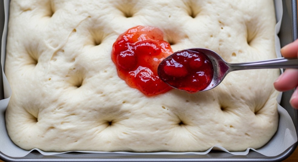 This focaccia stands out because it turns a classic bread into a sweet treat. Traditional focaccia is savory, but this version uses sugar, butter, and jam to create a soft dessert bread.