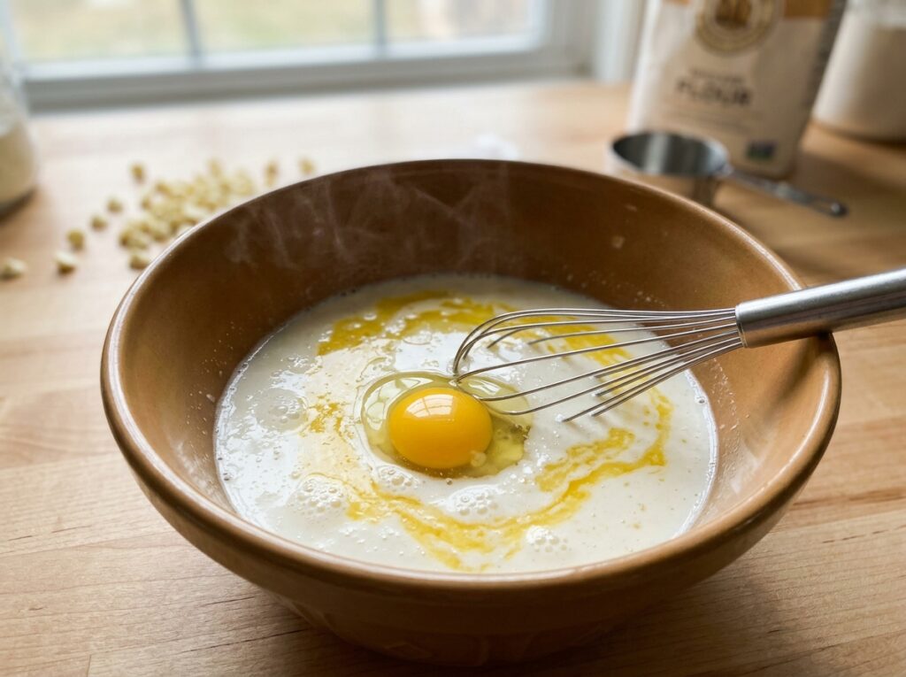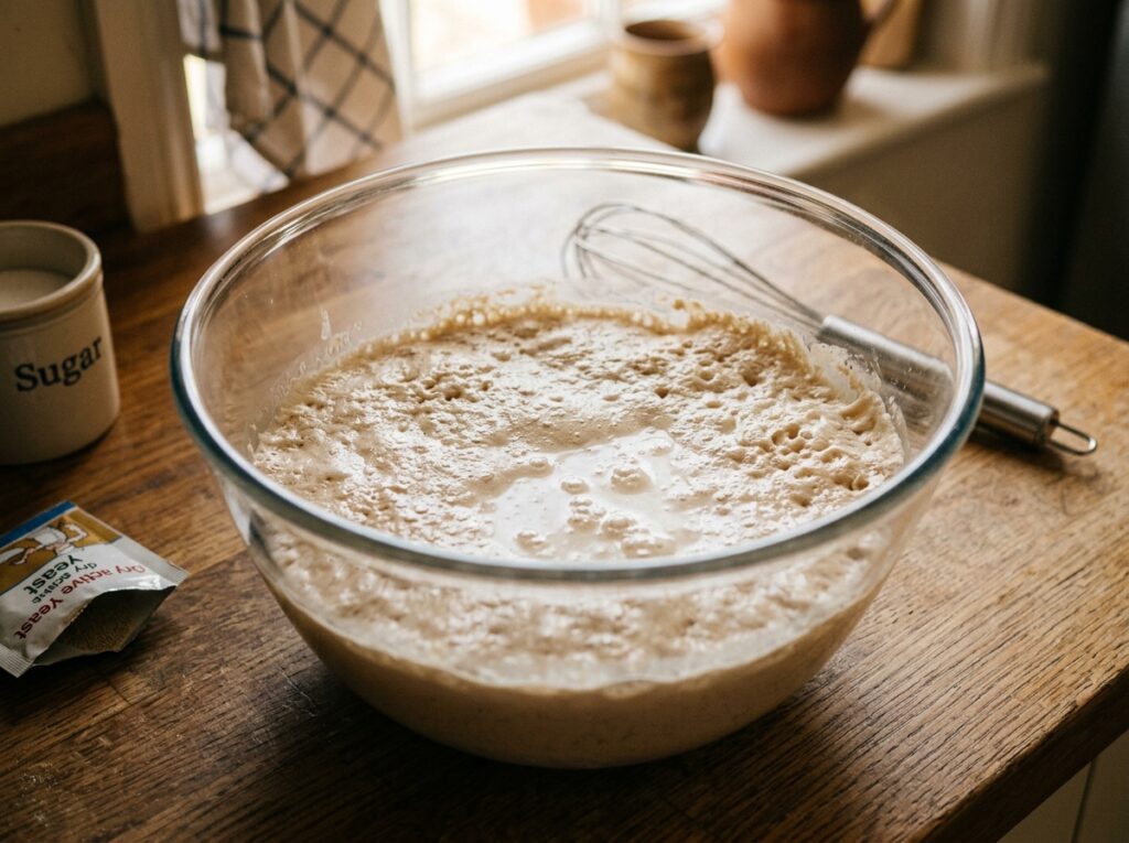 In a bowl, mix warm milk, sugar, and yeast. Let it sit for about 5–10 minutes until it becomes slightly frothy. This helps the bread rise properly.